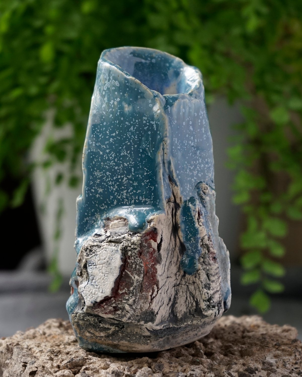 this vase has been hand carved from a block of custom blended clays, sand, and grog. after being fired once, various washes are applied to create depth and detail and glazes are brushed on. this glaze is a bright, glossy sea blue with small light blue crystals.